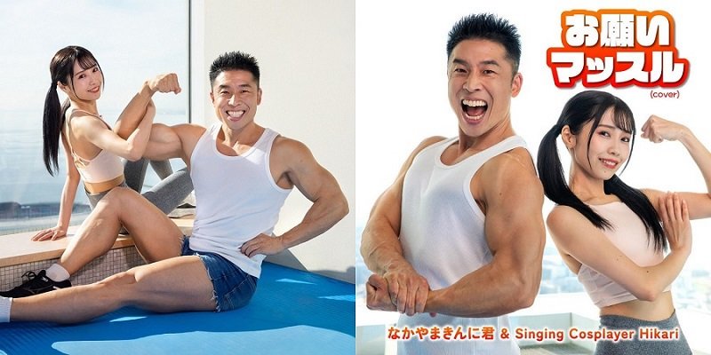 Nakayama Kinni-kun & Singing Cosplayer Hikari’s cover song, ‘Muscles Please!’ ‘will release to the entire world on January 26. The artist and the album cover photo has been revealed today. This song is going to be on air as the ending theme of the nationwide TV program “Doyou wa nani suru?! (What will you do on Saturday!?)” on both Kansai Telecasting Corporation and Fuji Television Network. The music video will be on air for 30 seconds every Saturday for 3 months. This is a great opportunity for them. This music video was shot at GOLD’S GYM at Makuhari Chiba ANNEX. While Nakayama Kinni-kun taught how to do the exercise, TikToker Singing Cosplayer Hikari choreographed the dancing. She hit upon the choreography one day before shooting day and they practiced it together right before shooting the music video. The key part of their collaboration movie was released on Singing Cosplayer Hikari’s TikTok today. Please check it out!